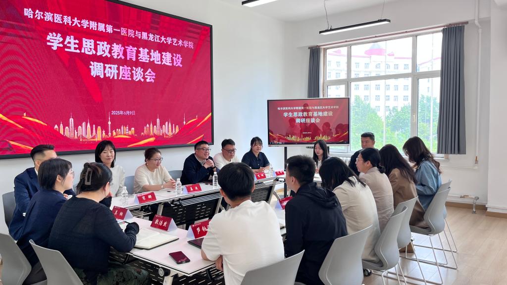 6月9日,艺术学院在艺术楼会议室与哈尔滨医科大学附属第一医院开展学生思政教育基地建设调研座谈会。艺术学院党委副书记朱军、哈尔滨医科大学附属第一医院党委副书记迟秋君共同主持座谈会,双方学院辅导员代表参加座谈。
