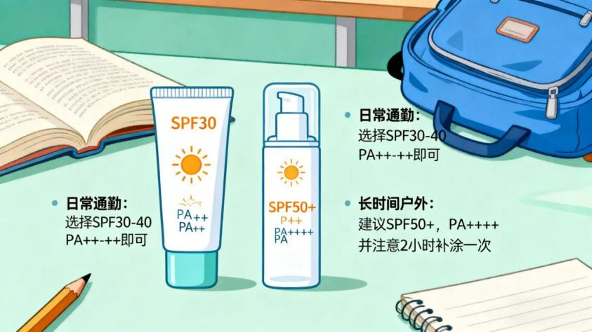 日常通勤(宿舍→教室→食堂):短时间户外选SPF25-30、PA++的基础款就够,重点看质地清爽不闷痘、易推开,能兼顾日常打底需求,大容量、价格亲民的款式更适合学生党高频使用;