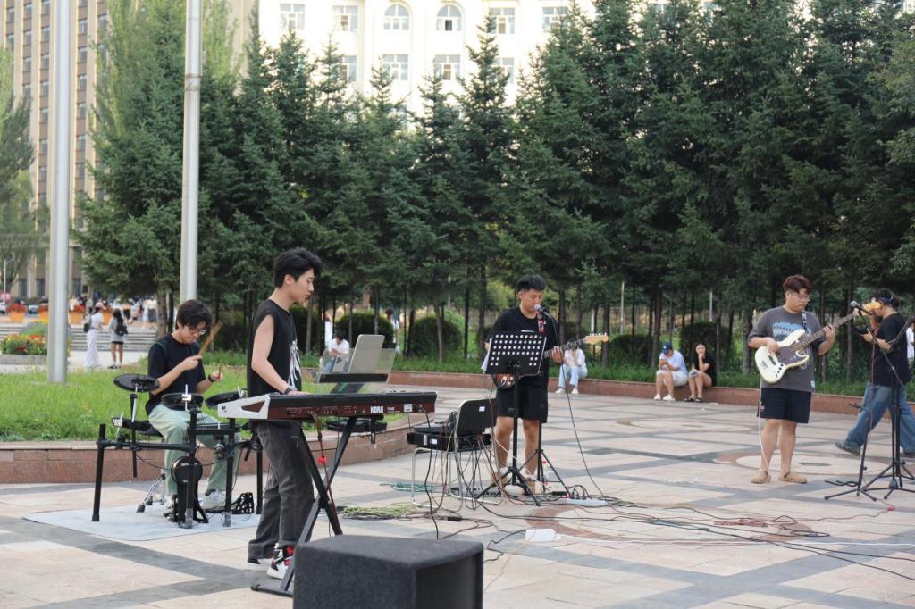 最后,新生队伍穿过艺术楼到达了晨曦广场,在这里等待大家的是艺术学院为欢迎新同学特此邀请的乐队。电吉他和键盘的碰撞使现场的气氛再一次充满激情活力,同学们徜徉在摇滚歌曲的旋律中,此起彼伏的尖叫声与呐喊声将场面推向高潮。