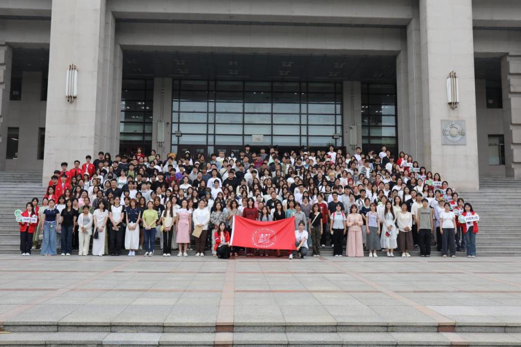 随后,由团委干事们带领新同学们抵达汇文楼,团委干事刘雨霄为新生们悉心地讲解,并在汇文楼前拍下来新生们的第一张大合照。