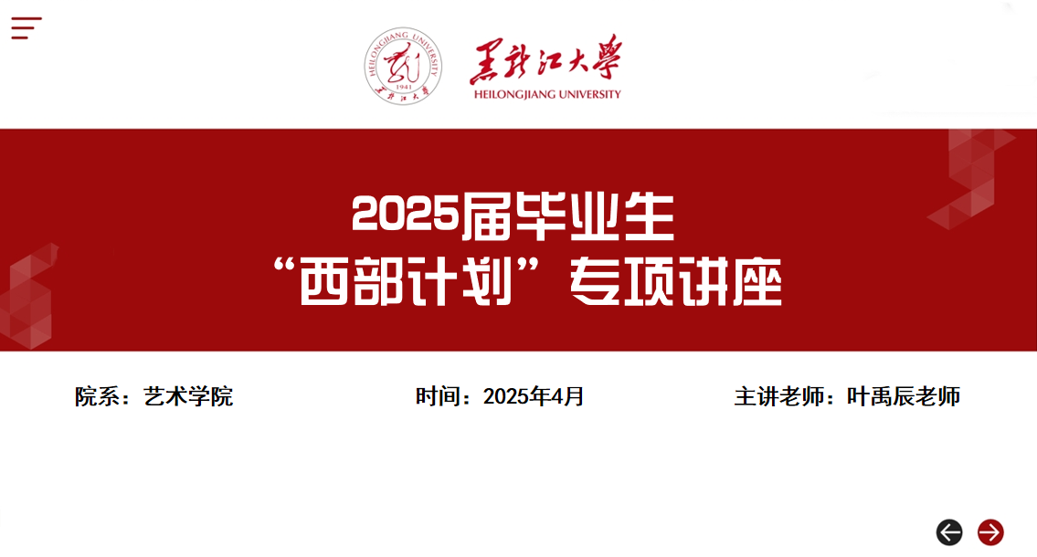 为响应国家号召,帮助同学们了解西部计划相关政策,进一步引导同学们主动融入国家发展大局,鼓励毕业生积极投身基层建设。艺术学院于2025年4月28日18:00通过腾讯会议举办“西部计划”专题宣讲会。本次宣讲会由学院2021级辅导员叶禹辰老师主讲,2021级全体学生参会。